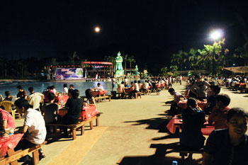 活動(dòng)當(dāng)日,長江水世界流光溢彩、歌聲飛揚(yáng)。在造浪池沙灘旁,圓月當(dāng)空、濤聲拍岸,領(lǐng)導(dǎo)與員工濟(jì)濟(jì)一堂,共仰明月,齊享美食,并不時(shí)走動(dòng)暢談。公司為到場的所有員工和家屬提供了豐盛的應(yīng)節(jié)食品,包括各式月餅、爽滑雞粥、濕炒河粉、新鮮水果、芋頭、菱角等,現(xiàn)場氣氛和美,其樂融融,讓員工真正感受到了金馬“家”的溫暖貼心。