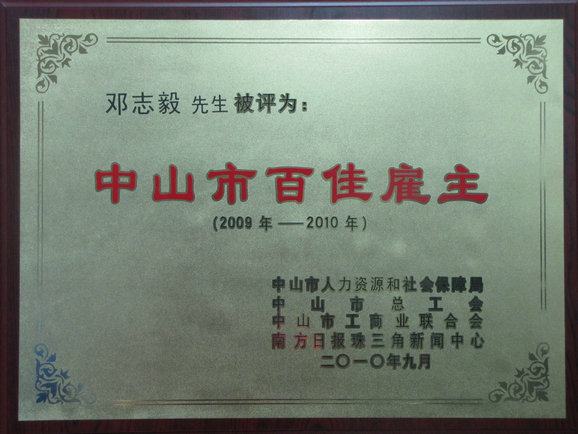 2010年9月13日下午2:00,中山市2010年度百佳雇主頒獎(jiǎng)典禮暨“同是中山建設(shè)者”百佳流動(dòng)務(wù)工人員評(píng)選活動(dòng)啟動(dòng)儀式在市文化藝術(shù)中心大劇場(chǎng)舉行。伴隨著現(xiàn)場(chǎng)近千名觀眾的熱烈掌聲,由中山市人力資源和社會(huì)保障局、中山市總工會(huì)、中山市工商聯(lián)以及南方日?qǐng)?bào)珠三角新聞中心共同舉辦的“中山市首屆百佳雇主”評(píng)選結(jié)果正式揭曉,我司在眾多申報(bào)企業(yè)中脫穎而出,獲“中山市首屆百佳雇主”殊榮。