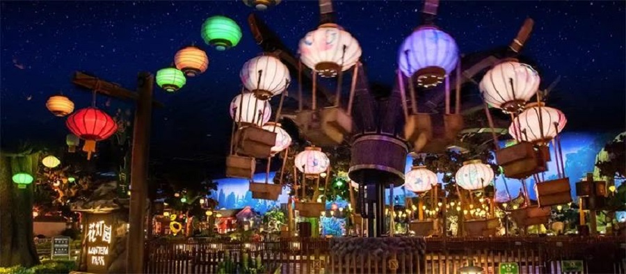功夫熊貓蓋世之地屬于北京環(huán)球影城獨(dú)有,燈影傳奇也是國(guó)內(nèi)首創(chuàng)的設(shè)備。這一設(shè)備最大的特點(diǎn)是中國(guó)傳統(tǒng)文化跟現(xiàn)代游樂的相互融合,設(shè)備既有傳統(tǒng)建筑的元素,也有傳統(tǒng)燈籠的造型,燈籠上還有經(jīng)典的皮影戲元素;通過(guò)這些,把傳統(tǒng)文化以一種動(dòng)態(tài)的體驗(yàn)呈現(xiàn)給游客。為了還原中國(guó)復(fù)古燈籠的造型和效果,我們從燈籠骨架的設(shè)計(jì)、布料的選型、圖案的印刷工藝、縫制工藝到燈光的變色控制等,都經(jīng)過(guò)了反復(fù)的測(cè)試和改良,其中燈籠布料的選材既要求布料潤(rùn)澤有質(zhì)感,又要經(jīng)久耐用能承受長(zhǎng)期的張力,還要彈性軟硬適中不能起一絲皺褶,為此我們經(jīng)歷了6輪試制與測(cè)試,反復(fù)改良工藝,力求每個(gè)細(xì)節(jié)都能完美展現(xiàn)中國(guó)傳統(tǒng)燈籠的效果。