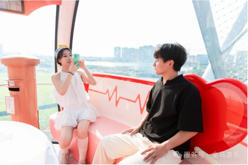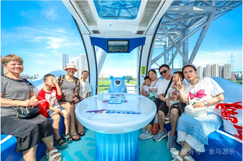 轉(zhuǎn)輪配備36個面積國內(nèi)領(lǐng)先的的橢圓形全景“太空艙”轎廂,單艙面積約6平方米,可容納8-10人,滿載可乘坐352人。艙內(nèi)設(shè)有環(huán)形座椅及中央活動區(qū),滿足全家同乘的寬敞舒適需求。獨特的吊掛式橢圓轎廂搭配360°全透明玻璃幕墻,營造無死角全景視野,游客可盡覽景區(qū)及壯闊長江風(fēng)光,仿佛置身云端,感受城市脈動。艙內(nèi)更融合技術(shù)創(chuàng)新與美學(xué)設(shè)計,打造了涵蓋極地、愛情、童趣等多種風(fēng)格的主題艙,以及驚險刺激的底部透明艙,支持婚禮、慶生、商務(wù)派對等主題定制活動。此外,艙內(nèi)還配備電子屏實時拍照、燈光氛圍調(diào)節(jié)等功能,滿足多元化場景需求。通過以上創(chuàng)新設(shè)計,成功將“楚天之眼”從傳統(tǒng)的觀景設(shè)施升級為多功能社交空間,塑造了武漢文旅新地標(biāo)。
