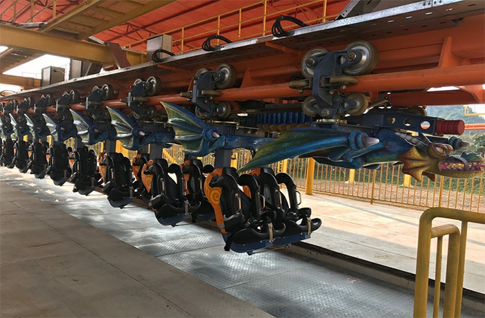 懸掛過山車的列車座椅懸掛于軌道下方,乘客懸空而坐,增加體驗刺激度。列車經(jīng)由動力提升到軌道最高端后,轉(zhuǎn)為沿軌道自由高速滑行,乘客坐于座椅上時盡情地享受失重、倒轉(zhuǎn)和離心的強(qiáng)烈感覺。列車外觀可根據(jù)樂園特色定制,幫助樂園打造專屬特色。