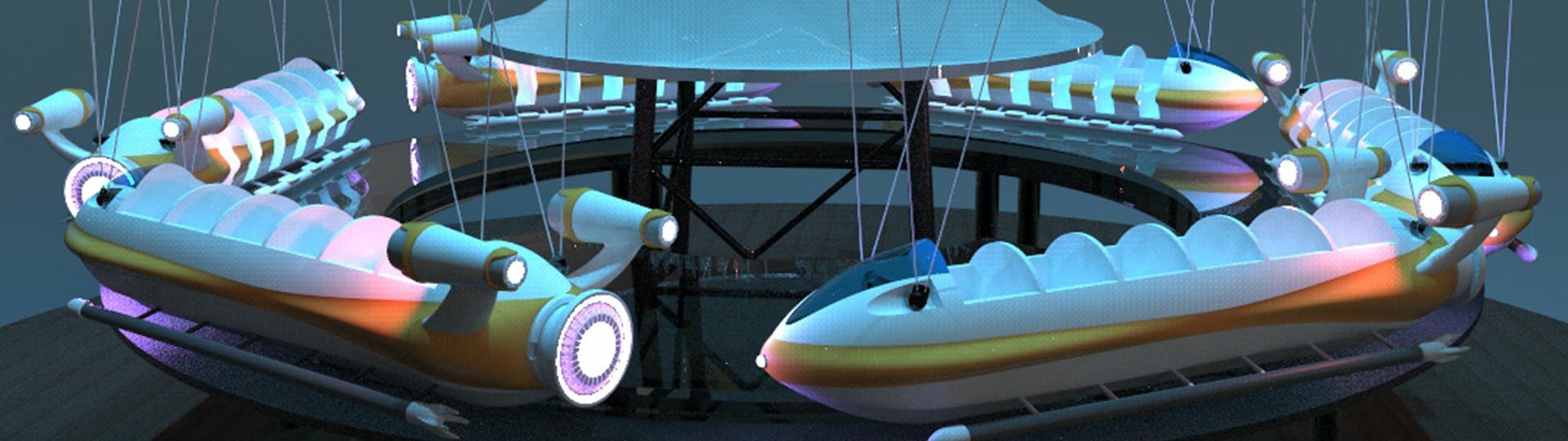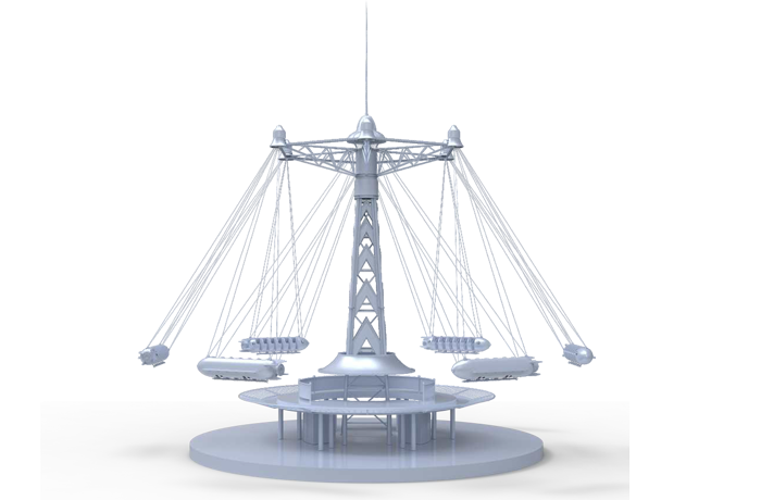 幻速追影六個(gè)飛機(jī)吊掛座艙隨同旋轉(zhuǎn)架相對(duì)塔體自由旋轉(zhuǎn)并外擺升起,繞中心立柱飛行,科幻又刺激。夜間智能燈光系統(tǒng)亮起,成為樂(lè)園一道的奇趣風(fēng)景線。