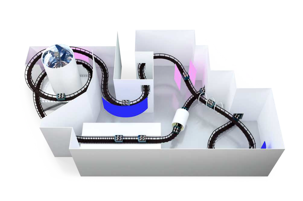 互動軌道?是?款室內(nèi)休閑游樂設(shè)備,將3D交互游戲和過??兩種元素有機結(jié)合,乘客在游玩過程中既能體驗3D?體的主題視覺效果,?能體驗過??刺激,還互動參與激烈的射擊競賽,是?款新穎的架空游覽?項?。