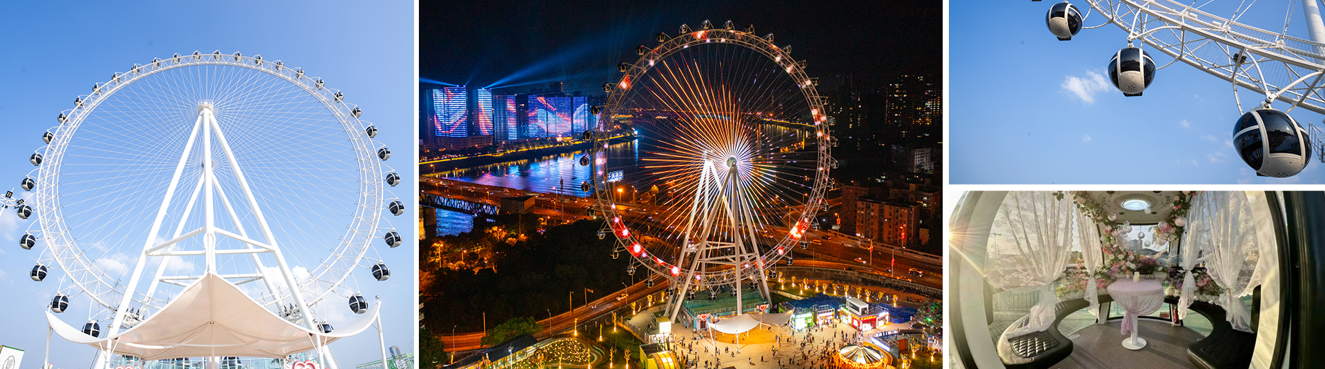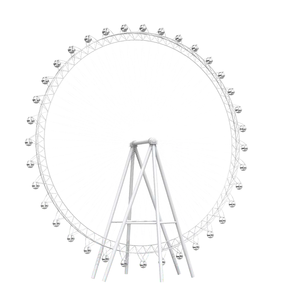 88?觀覽?,塔架由6根?柱構(gòu)成,觀覽?的設(shè)計打破傳統(tǒng)摩天輪的界限,將拉膜造型與摩天輪相互結(jié)合,融為?體,使摩天輪在感官上更加宏偉壯觀,專為地標(biāo)項?打造。夜幕降臨,摩天輪運作時配以明麗變幻的燈飾與外觀造型相互呼應(yīng),使得摩天輪成為閃耀的地標(biāo)打卡點。