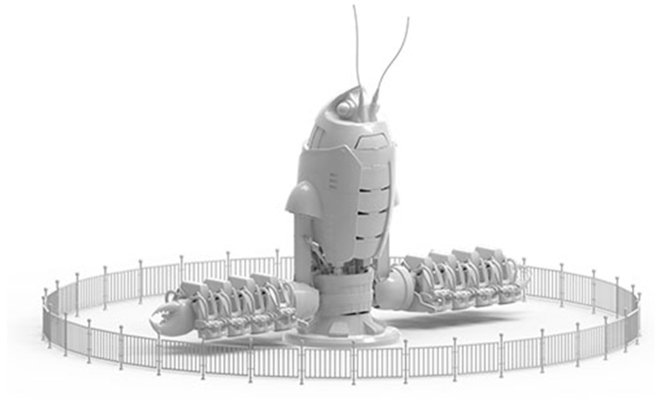 JQJ-16A巨鉗戰(zhàn)甲,設(shè)備結(jié)構(gòu)較新穎,體驗(yàn)感驚險(xiǎn)刺激。開(kāi)始運(yùn)?時(shí)設(shè)備主體先上升,上升到?定?度后,進(jìn)?公轉(zhuǎn)并伴隨著座艙的?轉(zhuǎn)和升降臂的升降。整體包裝設(shè)計(jì)采?機(jī)械?蝦造型,標(biāo)志性的?蝦紅配?加上煙霧、燈光的效果,帶給游客歡樂(lè)、刺激的體驗(yàn)。
